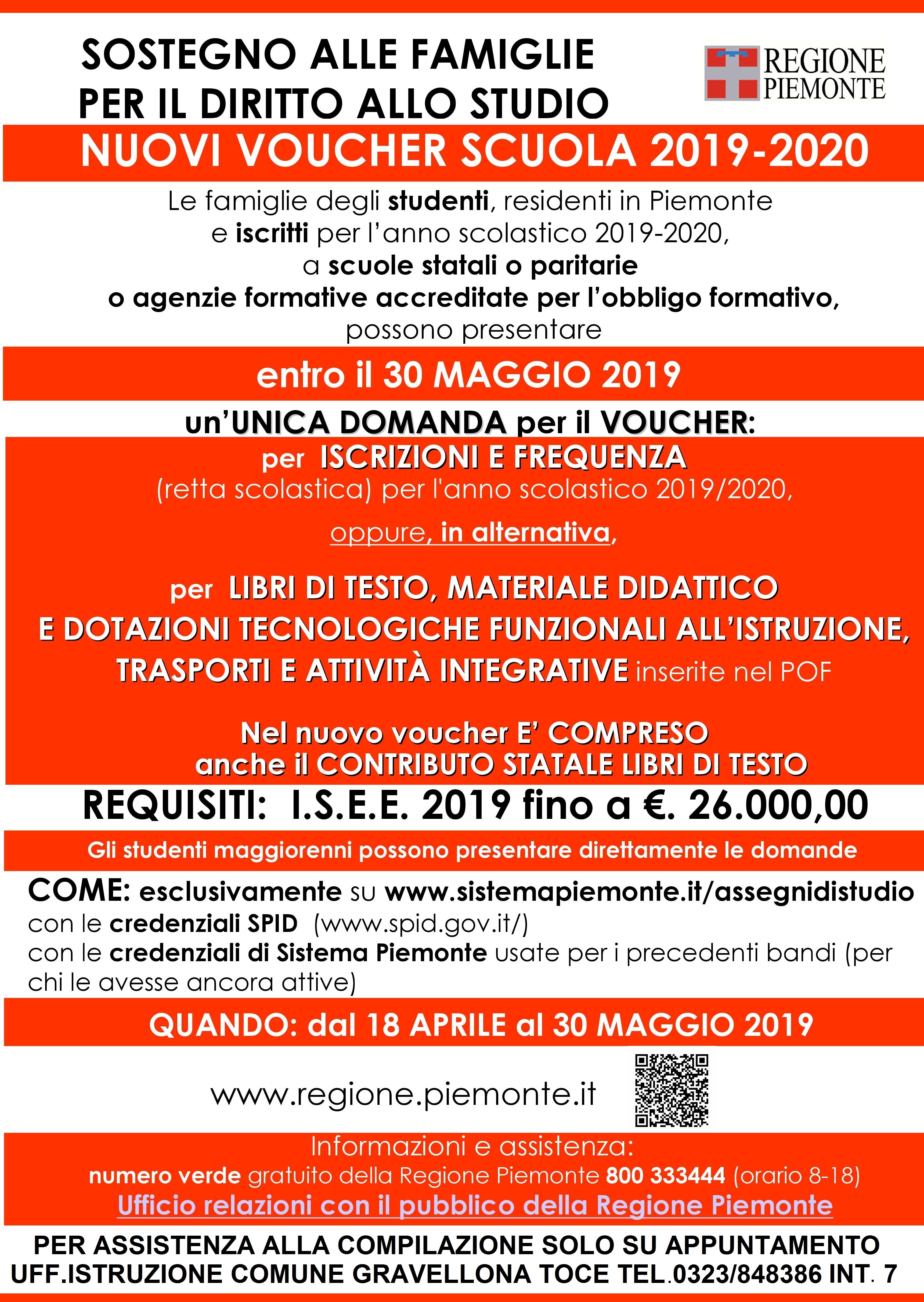 La Regione Piemonte ha emesso il nuovo bando per il voucher scuola per il sostegno alle famiglie per il diritto allo studio per l'a.s. 2019/2020. Le domande possono essere presentate solo on line sul sito www.sistemapiemonte.it/assegnidistudio fino al 30 maggio 2019 con le credenziali già utilizzate lo scorso anno o con le credenziali SPID. L'ISEE 2019 deve essere inferiore a € 26.000,00. L'Ufficio Istruzione del Comune di Gravellona Toce, solo per i residenti, fornisce assistenza alla compilazione previo appuntamento: