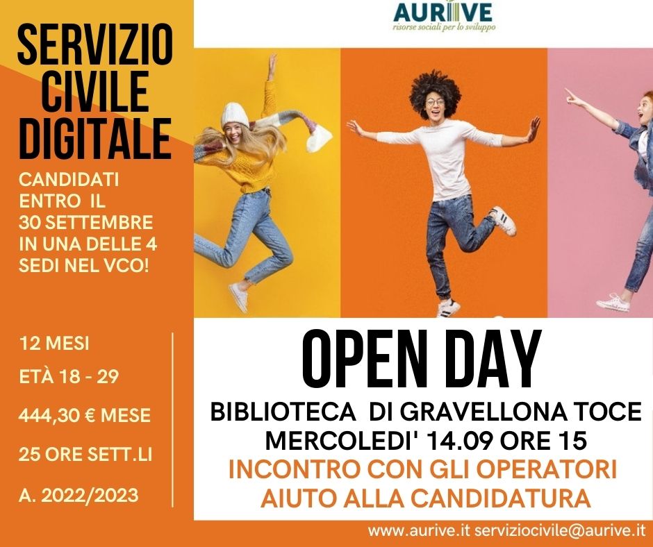 Nuove opportunità per i giovani con il Servizio Civile Digitale: 12 mesi con un orario medio settimanale di 25 ore in cui ragazzi e ragazze dai 18 ai 28 anni hanno l’opportunità di vivere esperienze utili per il proprio percorso umano e professionale ricevendo un compenso mensile di euro 444,50. Nell'Ufficio Servizi alla persona e nella Biblioteca di Gravellona Toce i posti a disposizione sono 2. I giovani interessati possono inviare la candidatura La domanda va presentata on line entro le ore 14,00 del 30 settembre 2022 sul sito https://domandaonline.serviziocivile.it/ . E' necessario essere in possesso di SPID.