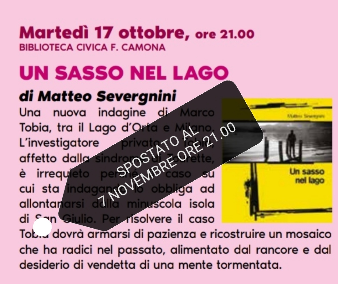La presentazione del libro di Matteo Severgnini "Un sasso nel lago" previsto nel programma dell'Ottobre culturale gravellonese per martedì 17 ottobre è stato spostato a MARTEDI 7 NOVEMBRE sempre alle 21.00 presso la Biblioteca Civica F. Camona di Gravellona Toce.