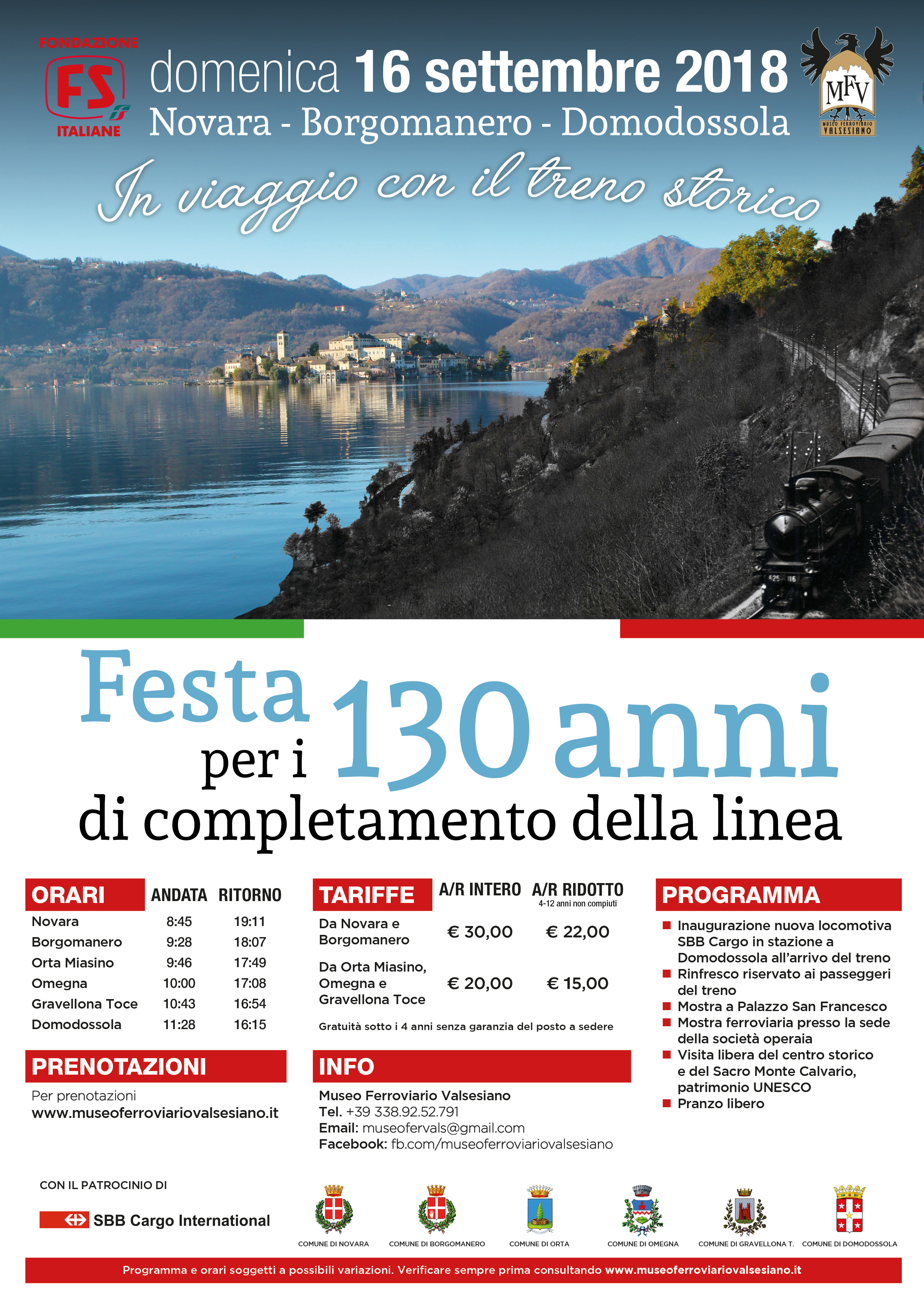 Domenica 16 settembre 2018, in occasione della festa per i 130 anni di completamento della linea ferroviaria Novara - Borgomanero - Domodossola, il Museo Ferroviario Valsesiano organizza un viaggio con il treno storico. Maggiorni informazioni sulla locandina allegata.