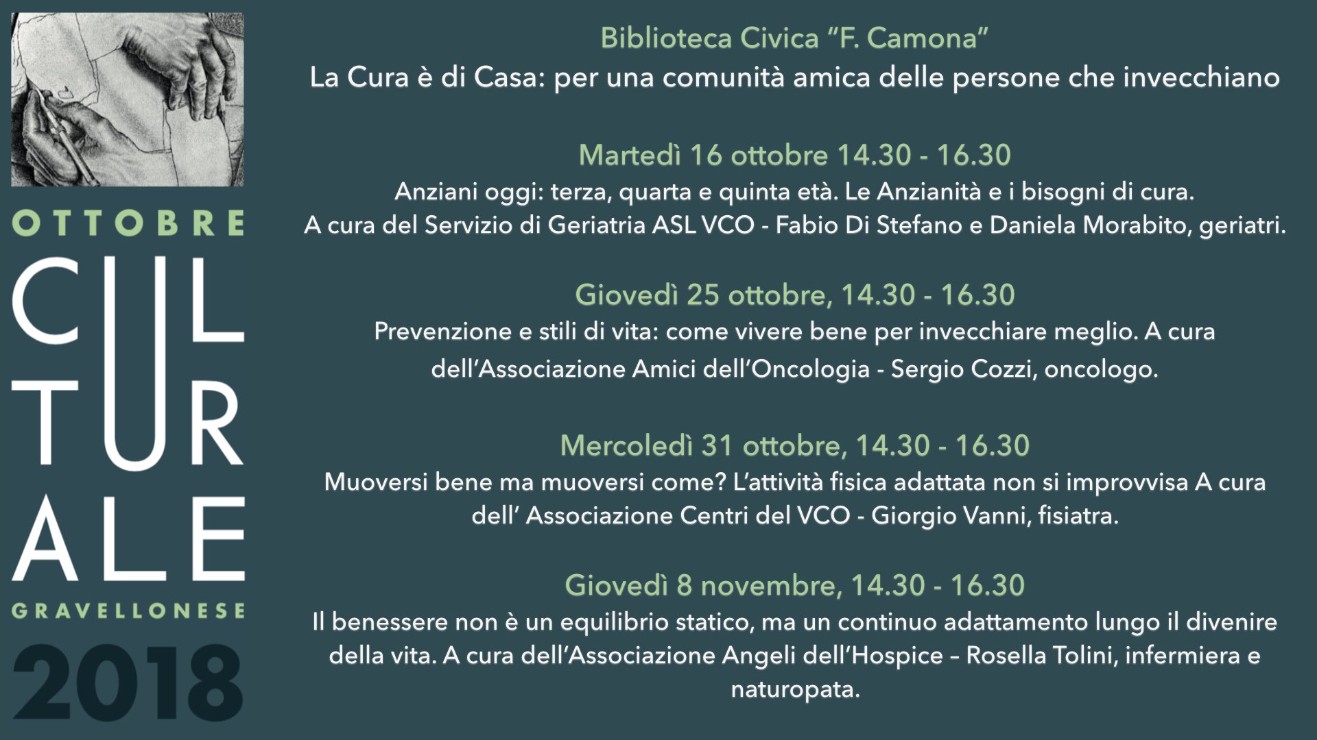 MARTEDI 16 OTTOBRE 2018 dalle 14.30 alle 16.30 presso la Biblioteca Civica F. Camona" si terrà il primo appuntamento del corso "La Cura è di casa" dal titolo: Anziani oggi: terza, quarta e quinta età. Le Anzianità e i bisogni di cura.