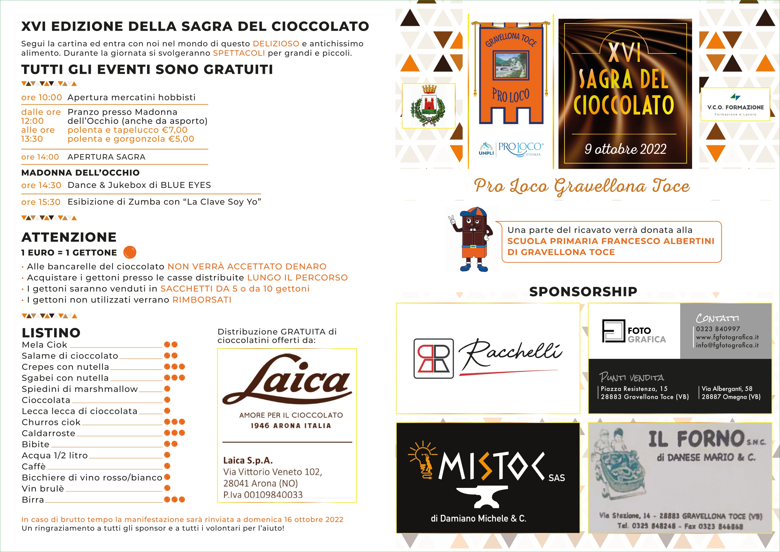 E' stata rinviata a DOMENICA 16 OTTOBRE la XVI Edizione della Sagra del cioccolato organizzata dall'Associazione Pro Loco di Gravellona Toce. La manifestazione avrà inizio alle ore 10.00 in zona Madonna dell'Occhio con l'apertura dei mercatini. Nel pomeriggio si alterneranno spettacoli di intrattenimento e giochi per bambini con la distribuzione di tante specialità al cioccolato!