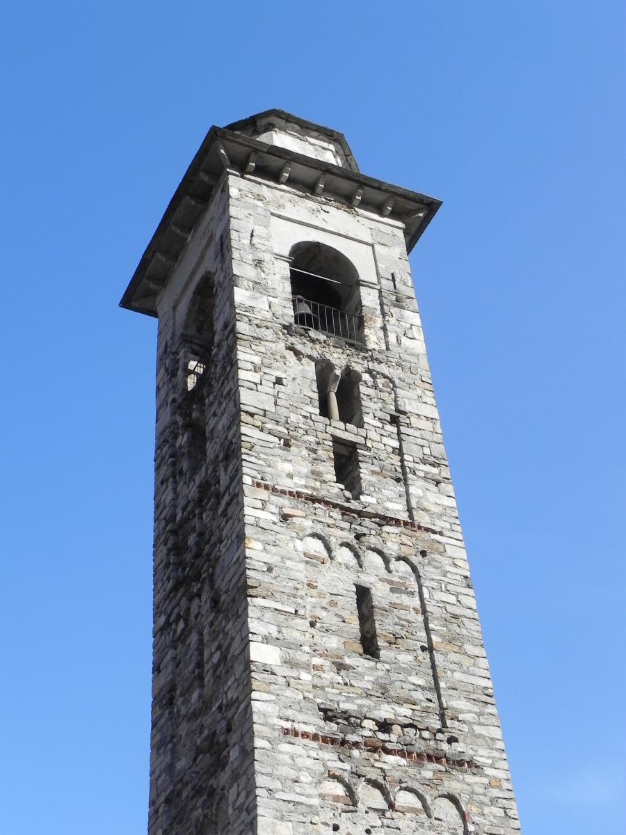 Del pregevole impianto romanico resta anche il campanile su cinque piani se-gnati da cornici ad archetti ciechi e fasce di laterizi disposti a dente di sega; le colonnine delle bifore presentano capitelli scolpiti con motivi zoomorfi, geometrici e una testina. Per le caratteristiche architettoniche la torre campanaria è considerata più antica della chiesa e risalente all’XI secolo, mentre la sopraelevazione con la cella campanaria sembra realizzata in due tempi e con caratteristiche murarie differenti: un primo innalzamento è interamente in blocchi squadrati di marmo di Candoglia, un secondo, intonacato, propone una terminazione ottagonale di gusto barocco.