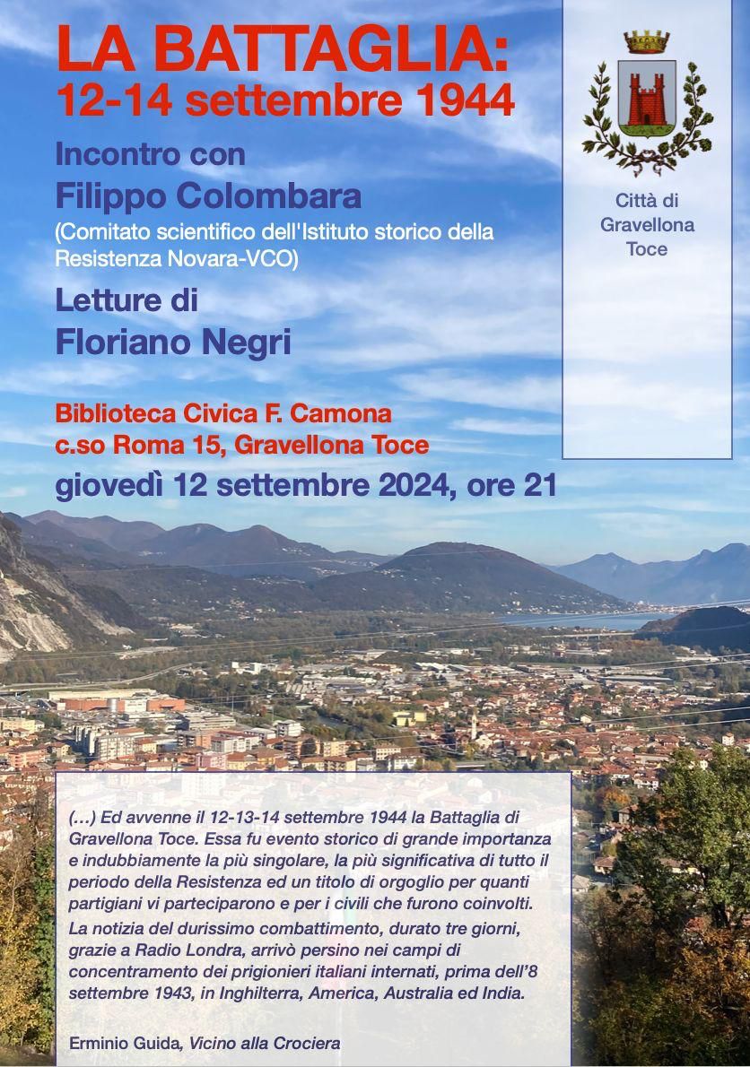 La cittadinanza è invitata a partecipare all’evento organizzato in occasione dell’80° anniversario della Battaglia di Gravellona Giovedì 12 settembre 2024 alle ore 21,00 presso la Biblioteca Civica “F. Camona”. Interverrà Filippo Colombara ( Comitato scientifico dell'Istituto Storico della Resistenza di Novara-VCO) - letture di Floriano Negri.