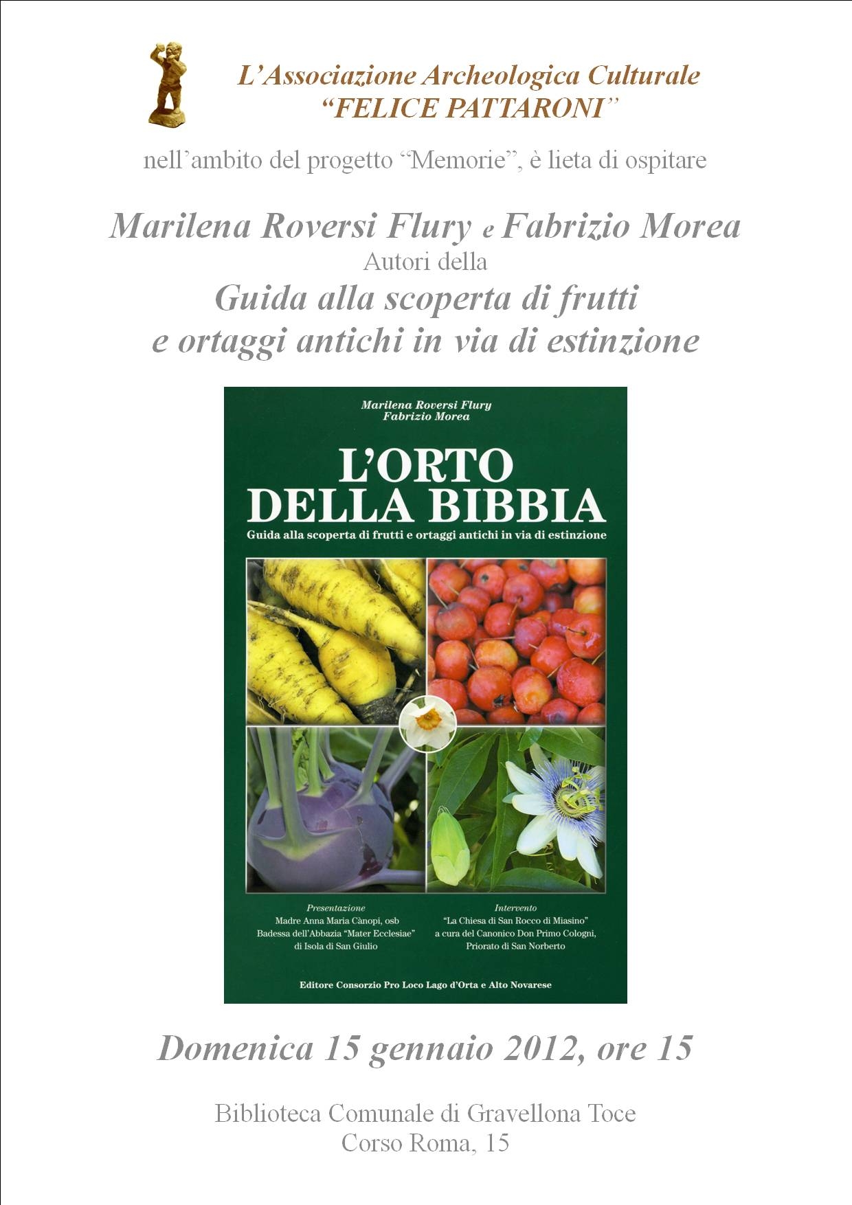DOMENICA 15 GENNAIO 2012, ORE 15,00, presso la Biblioteca Civica di Gravellona Toce "F. Camona" in Corso Roma, 15, l'Associazione Archeologica Culturale "Felice Pattaroni", nell'ambito del progetto "Memorie", presenta il libro"L'Orto della Bibbia. Guida alla scoperta di frutti e ortaggi antichi in via di estinzione". Saranno presenti gli autori Marilena Roversi Flury e Fabrizio Morea.