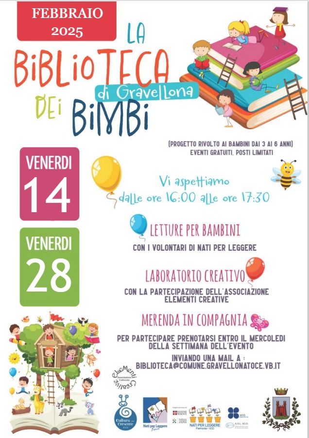 Il 14 e il 28 febbraio 2025 presso la Biblioteca Civica F. Camona di Gravellona Toce dalle ore 16,00 i volontari di Nati per leggere incontreranno i bambini dai 3 ai 6 anni di età per delle letture animate, laboratori in collaborazione con l'Associazione Elementi Creative e una merenda insieme. La partecipazione è gratuita. I posti disponibili sono 20, è necessaria la prenotazione obbligatoria entro il mercoledì della settimana dell'evento telefonando alla Biblioteca Civica al numero 0323846161 dal lunedì al sabato dalle 9 alle 12 e lunedi, mercoledì e venerdì anche dalle 15 alle 18.