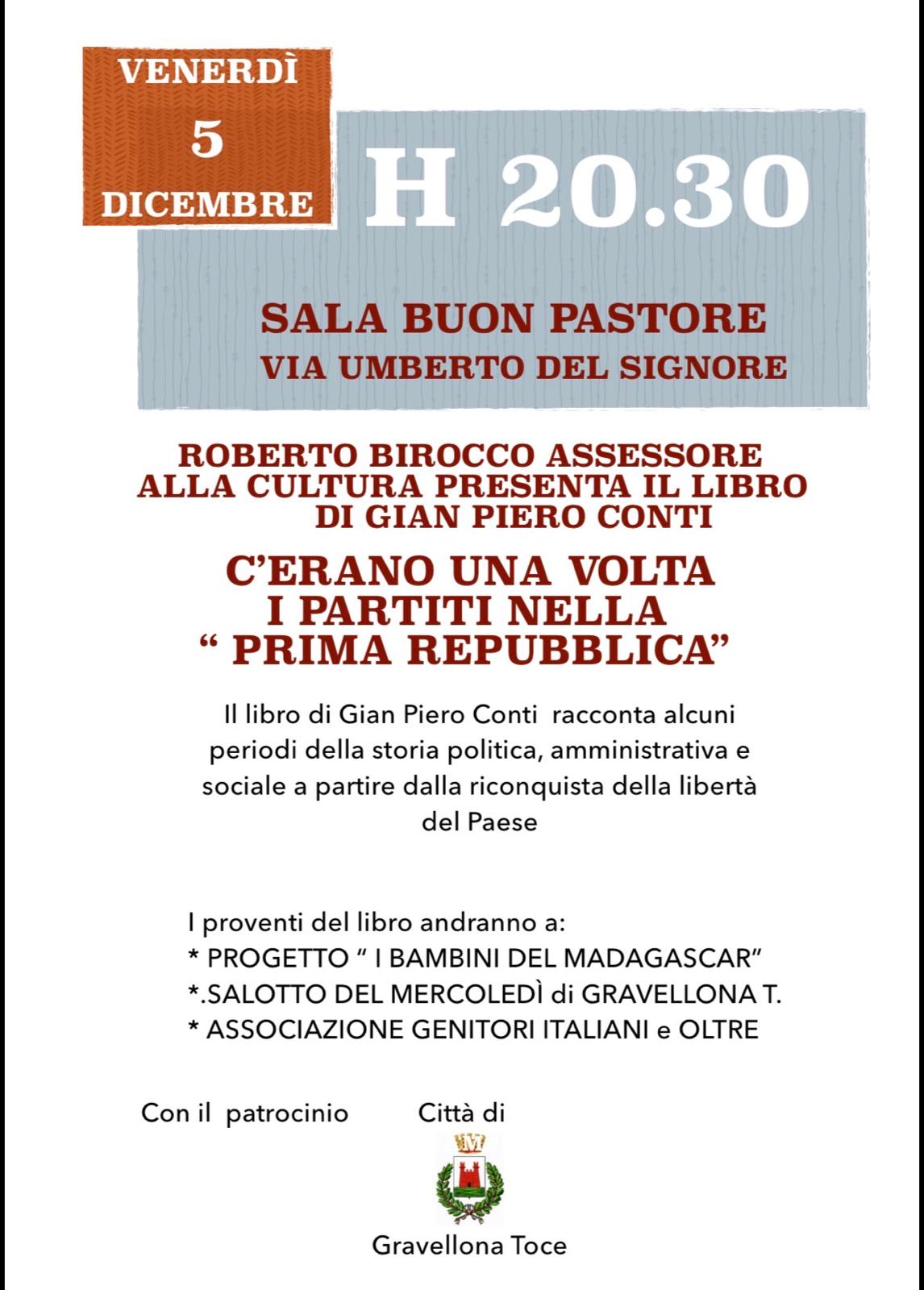 Venerdì 5 dicembre 2025 alle ore 20,30 presso la sala Buon pastore (Via Umberto del Signore, n. 1) con il patrocinio dell'Amministrazione comunale di Gravellona Toce l'assessore alla cultura Roberto Birocco presenta il libro "C'erano una volta i partiti nella prima repubblica" di Gian Piero Conti. Il libro racconta alcuni periodi della storia politica, amministrativa e sociale a partire dalla riconquista della libertà del paese. I proventi del libro saranno devoluti a: 1) Progetto "I bambini del madagascar"; 2) Il salotto del mercoled' di Gravellona Toce; 3) Associazione Genitori Italiani e oltre.