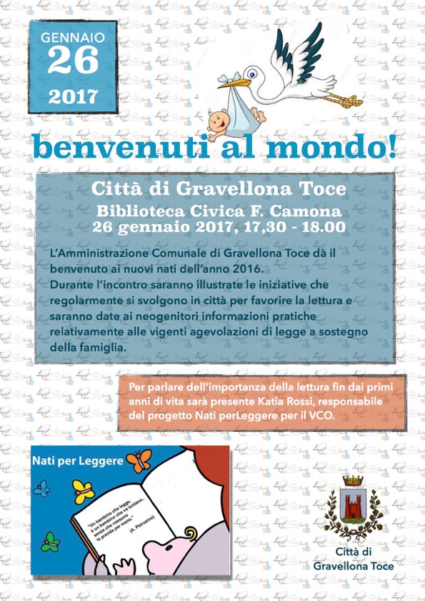 Giovedì 26 gennaio 2017 alle ore 17,30 presso la Biblioteca Civica "F. Camona" l'Amministrazione Comunale di Gravellona Toce dà il benvenuto alle bambine e ai bambini nati nel 2016 donando ai genitori presenti il libro MANO MANINA (Edizioni Franco Panini Ragazzi), adatto ai bambini sotto l'anno di età. Per parlare dell'importanza della lettura fin dai primi anni di vita sarà presente Katia Rossi, responsabile del progetto Nati Per Leggere per il VCO. L’occasione fornita da questo speciale “Benvenuto” sarà utilizzata anche per dare alcune utili informazioni pratiche ai neogenitori relativamente alle vigenti agevolazioni di legge a sostegno della famiglia.