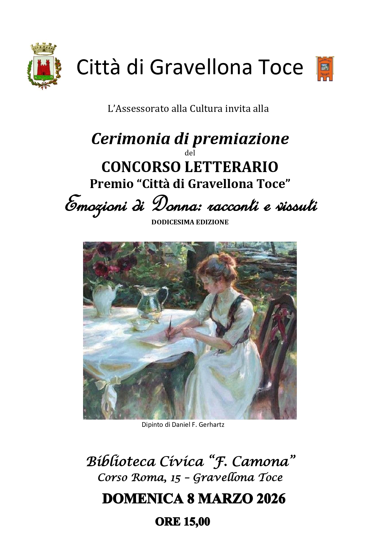Domenica 8 marzo 2026 alle ore 15,00 presso la Biblioteca Civica F. Camona di Gravellona Toce - Corso Roma, 15 si terrà la cerimonia di premiazione della dodicesima edizione del concorso letterario Premio Città di Gravellona Toce "Emozioni di donna: racconti e vissuti". L'evento è ad ingresso libero, è aperto a tutti i partecipanti e alla cittadinanza. Durante la cerimonia verranno resi noti i nomi dei primi tre classificati e dei tre racconti che riceveranno la menzione speciale della giuria. Da lunedì 9 marzo verrano pubblicati sul sito istitutionale del Comune di Gravellona Toce i testi dei sei racconti premiati.