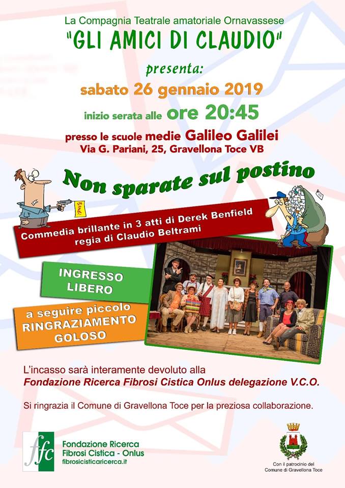 Sabato 26 gennaio 2019 ore 20.45 presso la palestra della scuola media “G. Galilei” di Gravellona Toce Presenta la commedia “Non sparate sul postino” il cui incasso sarà interamente devoluto alla Fondazione Ricerca Fibrosi cistica Onlus delegazione VCO.