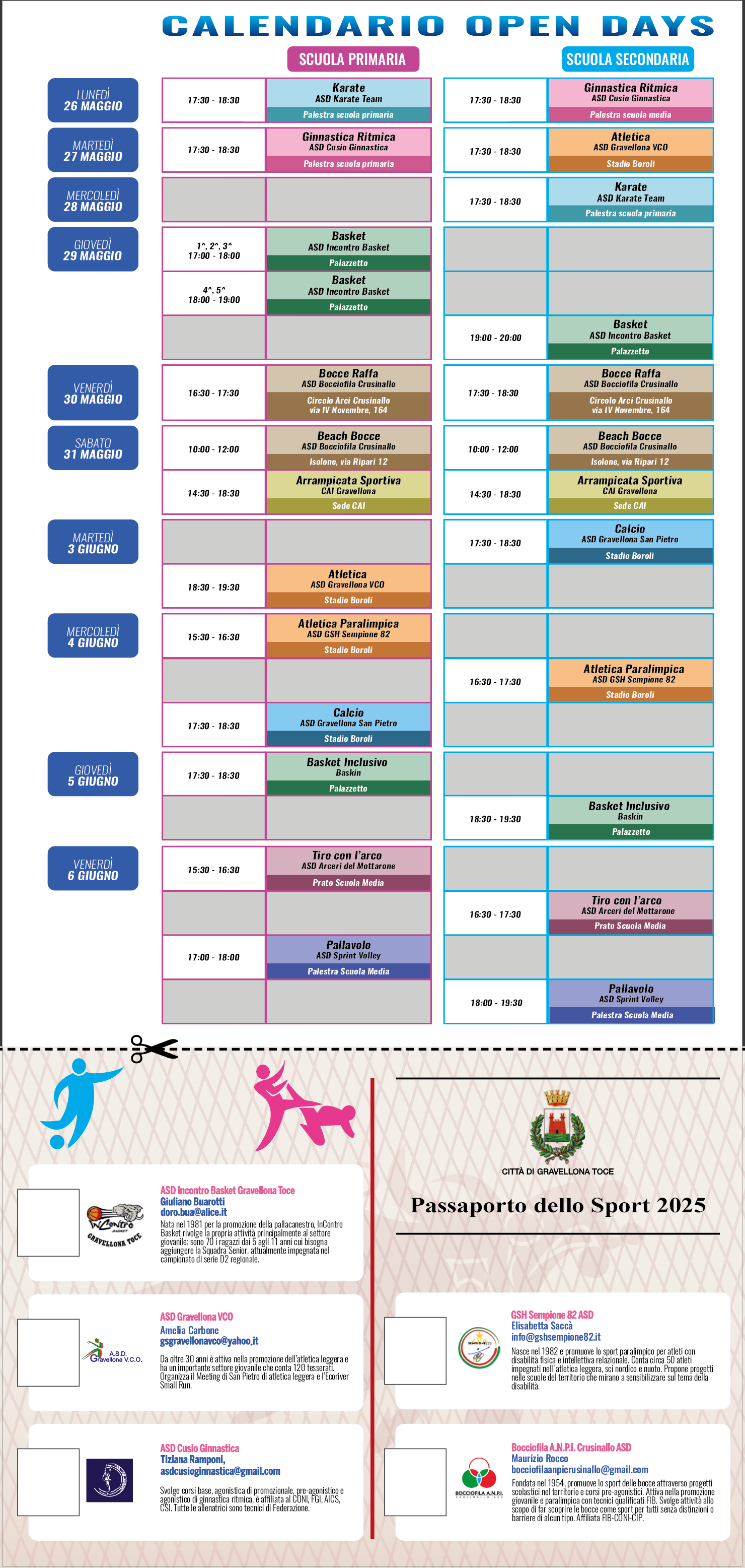 Dal 26 maggio al 7 giugno 2025 il Comune di Gravellona Toce organizza la Festa dello Sport. Le Associazioni sportive dal 26 maggio al 6 giugno con gli "Open days" daranno la possibilità ai bambini di conoscere i diversi sport secondo il calendario allegato. Mercoledì 28 maggio alle ore 21,00 presso la Biblioteca Civica "F. Camona" in Corso Roma, 15 si terrà una conferenza dal titolo "Sport ed educazione: un legame che fa crescere" con la Dr.ssa Laura Cutrona, psicologa dello sport.