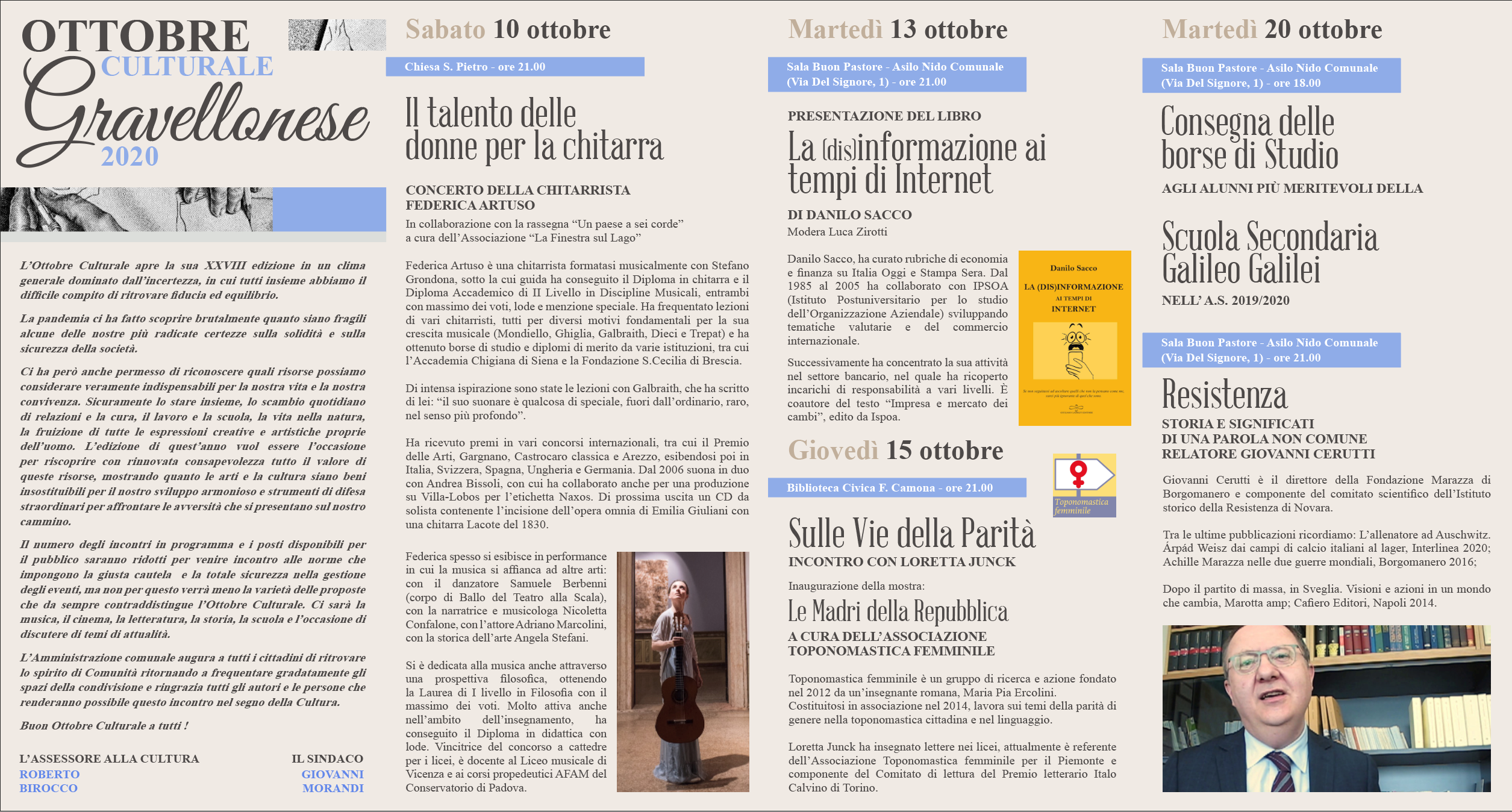 Dal 10 al 27 ottobre si terrà la XXVIII edizione dell'Ottobre Culturale Gravellonese. In allegato il programma. L'ingresso è gratuito ma per le misure di contrasto alla diffusione del Covid-19 i posti saranno limitati e sarà possibile partecipare agli eventi su prenotazione al numero 0323848386 int. 7 o inviando una mail a: servizisociali@comune.gravellonatoce.vb.it