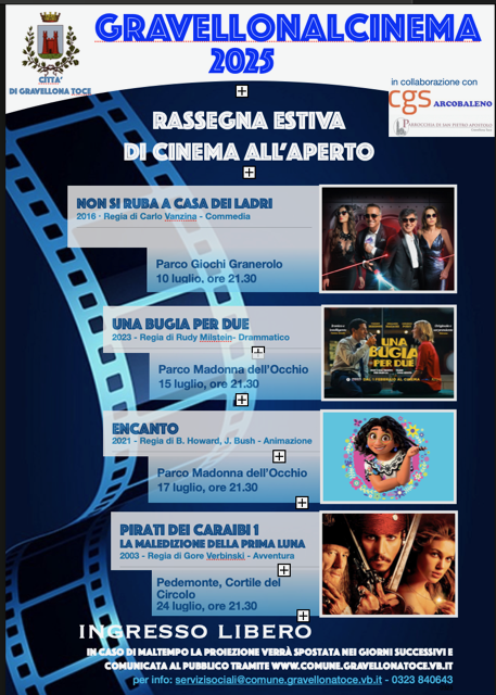 Il Comune di Gravellona Toce, in collaborazione con l'Associazione CGS Arcobaleno e la Parrocchia di San Pietro Apostolo, organizza la rassegna di cinema all'aperto "Gravellonalcinema" . Ingresso libero. Gli appuntamenti sono i seguenti:
